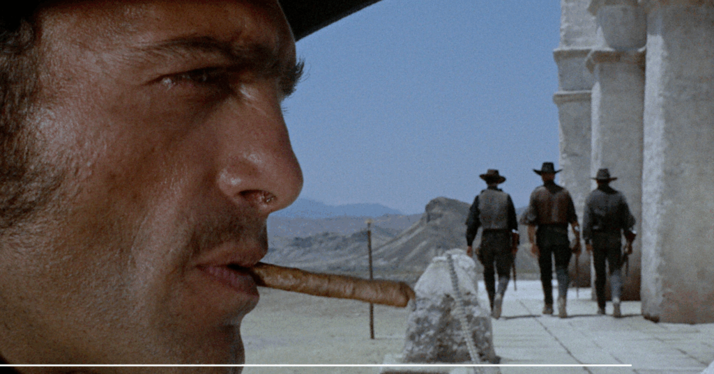 Come abbiamo già detto, i tempi durante i duelli si dilatano enormemente nell’attesa del primo sparo, lasciando che la tensione si nutra accompagnata dalla musica epica di Morricone.