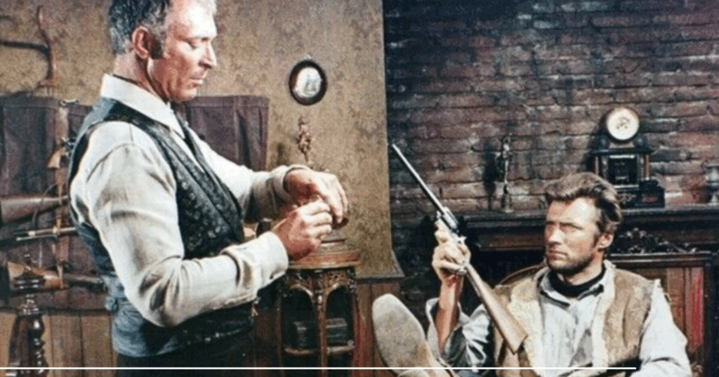 Per qualche dollaro in più (1965), di nome e di fatto: il budget del film è stimato intorno ai 600.000 euro odierni. Eastwood torna nella parte dell’ “Uomo senza nome”, una figura messianica, implacabile e laconica. Torna anche Gian Maria Volonté come cattivo: in Per un pugno di dollari era il trafficante d’armi Ramon Rojo, qui è il criminale tossicodipendente Indio.
